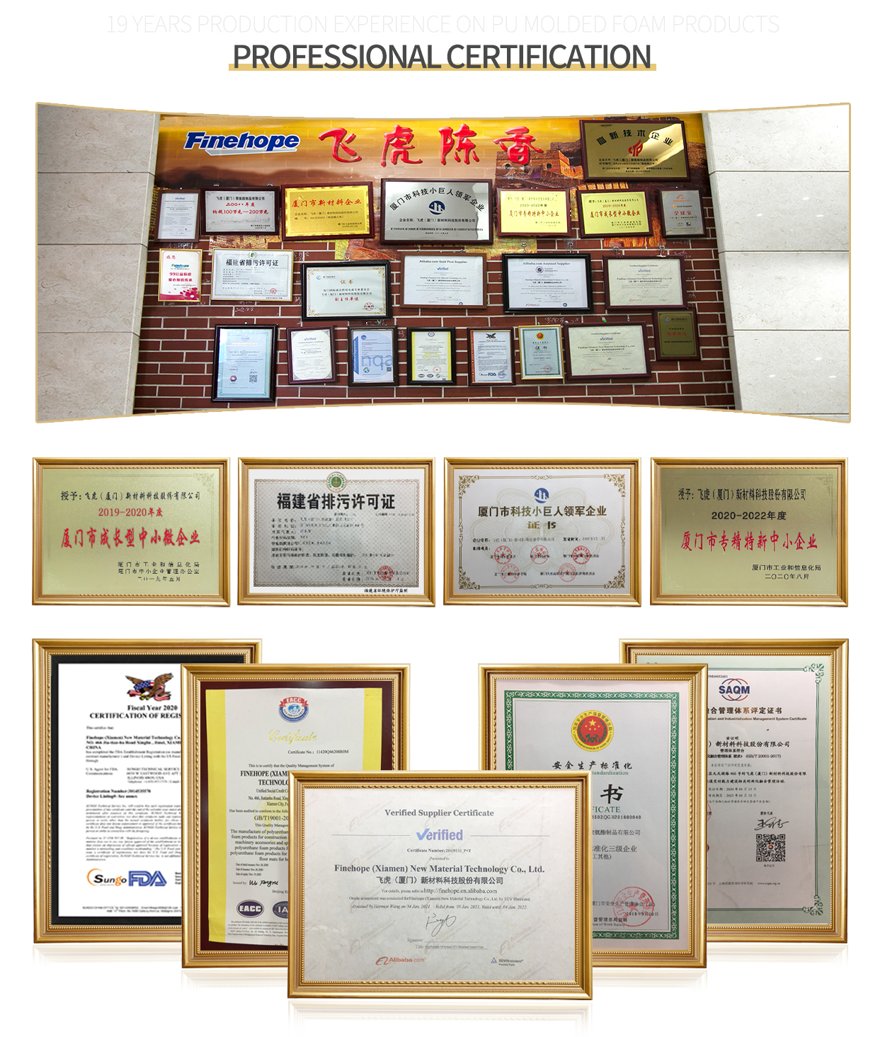Από το 2007, η Finehope έχει περάσει συνεχώς την πιστοποίηση TUV και έχει γίνει Επαληθευμένος Προμηθευτής Alibaba.